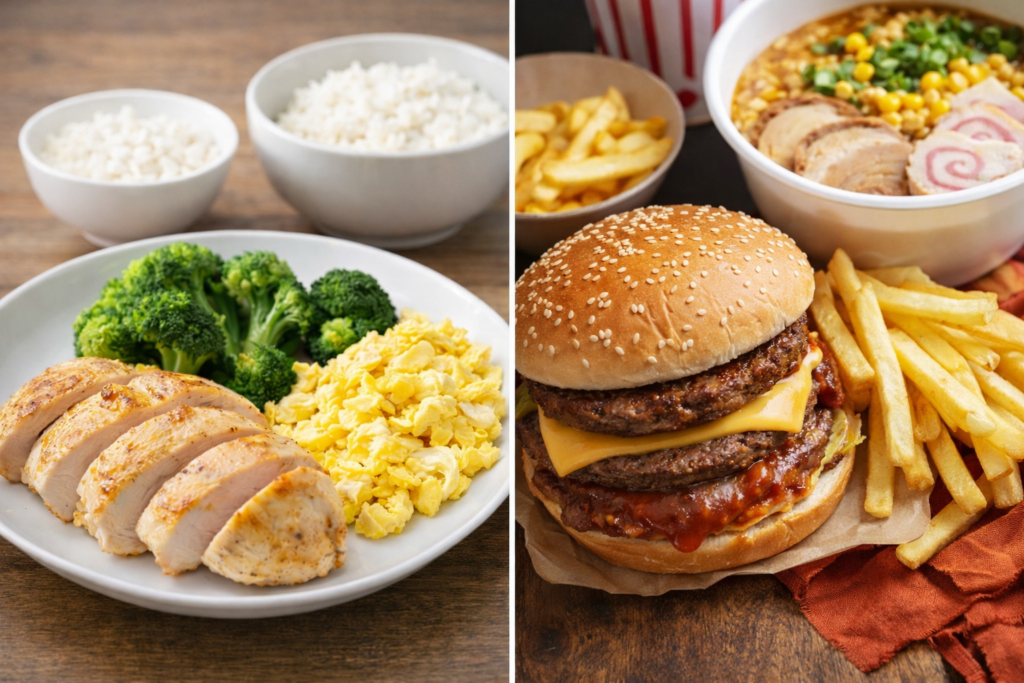 「カロリーさえ増えれば何でもいい」という考えで、ファストフード・揚げ物・スイーツを爆食するのは最悪のパターンです。脂肪が急増するだけでなく、腸内環境の悪化・炎症・パフォーマンス低下を招きます。増量期こそ食事の質を上げることが重要です。
